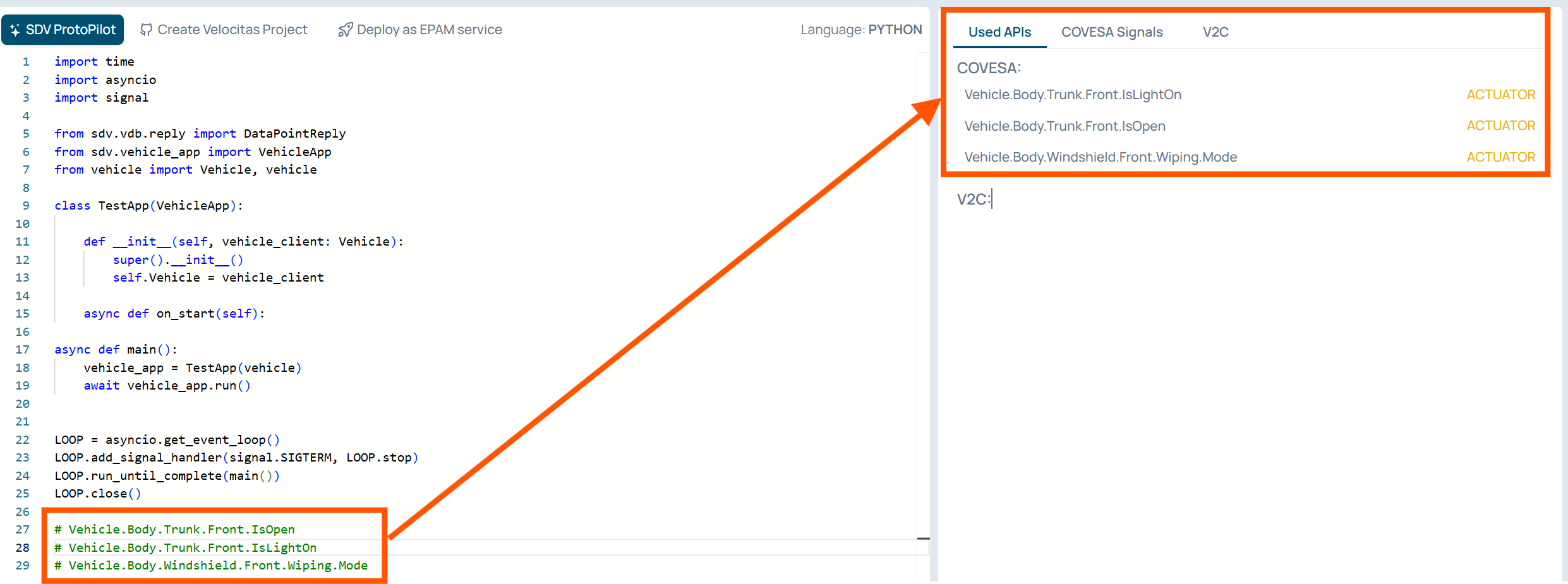 Used APIs에 생성, 주석처리된 코드도 동일) Vehicle.Body.Trunk.Front.IsOpen(주의.Vehicle.Body.Hood.IsOpenAPI를 사용하는 예제도 있지만 주로 사용하는3D_Car_UnityWidget에서는 호환 X)Vehicle.Body.Trunk.Front.IsLightOnVehicle.Body.Windshield.Front.Wiping.Mode